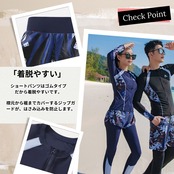 【UV対策】UVカット生地を使用しているので、着るだけで首元から足首までしっかり日差しからガード。日焼け対策のほか、虫刺され、クラゲ対策、擦り傷などの外傷対策にもオッケー。岩場等でのケガから身を守る為にも着いているだけで安心感UP!