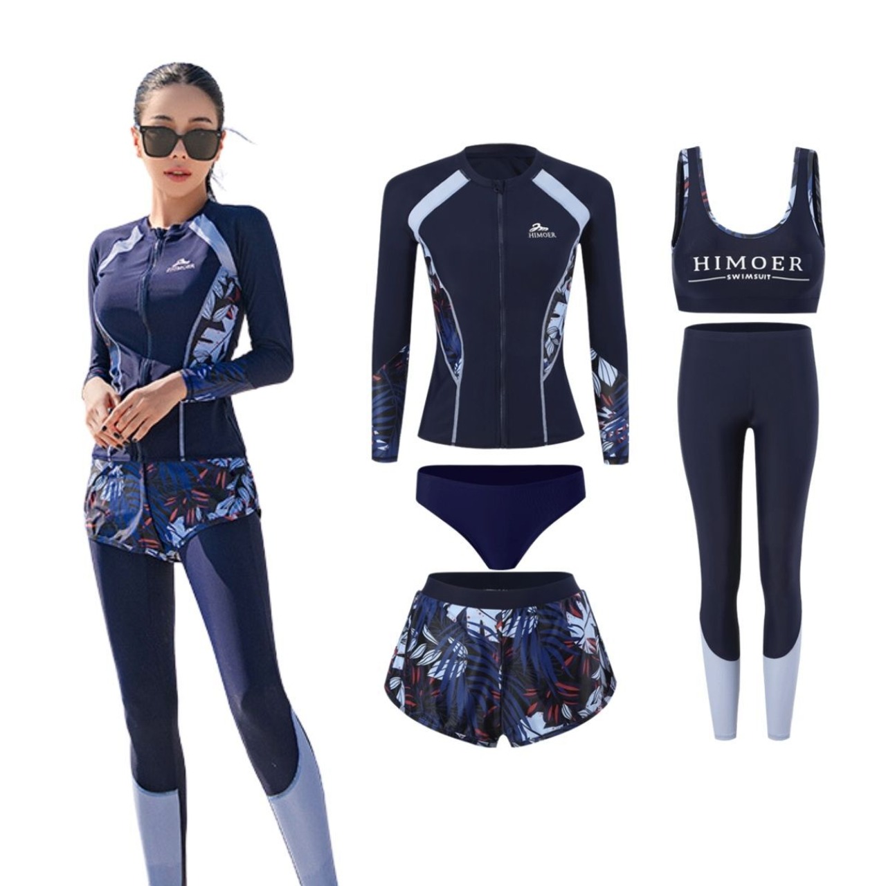 【水着豪華5点セット】ラッシュガード+ショートパンツ+レギンス+ブラ+ショーツ、使いやすく着回しがしやすい女性用水着5セットで、届いたらすぐに使えます。シンプルなカラーデザインなので着回しは自由自在、シーンに合わせて違った着回しをたのしむことができます!