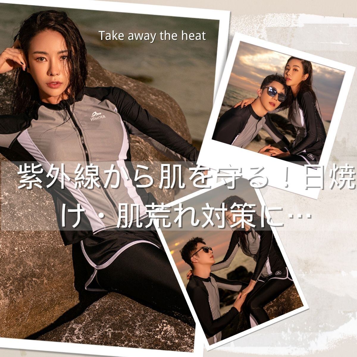 【長袖ラッシュガード】ラッシュガードは、擦り傷などをしやすい環境において、皮膚を保護するという役割があり、紫外線対策や暑熱対策としても役立つ。自体に保温効果はありませんが、吸汗速乾性に優れ、サイドラインを太くし、内側から色を切り替えることで、体のラインを細く見せる。