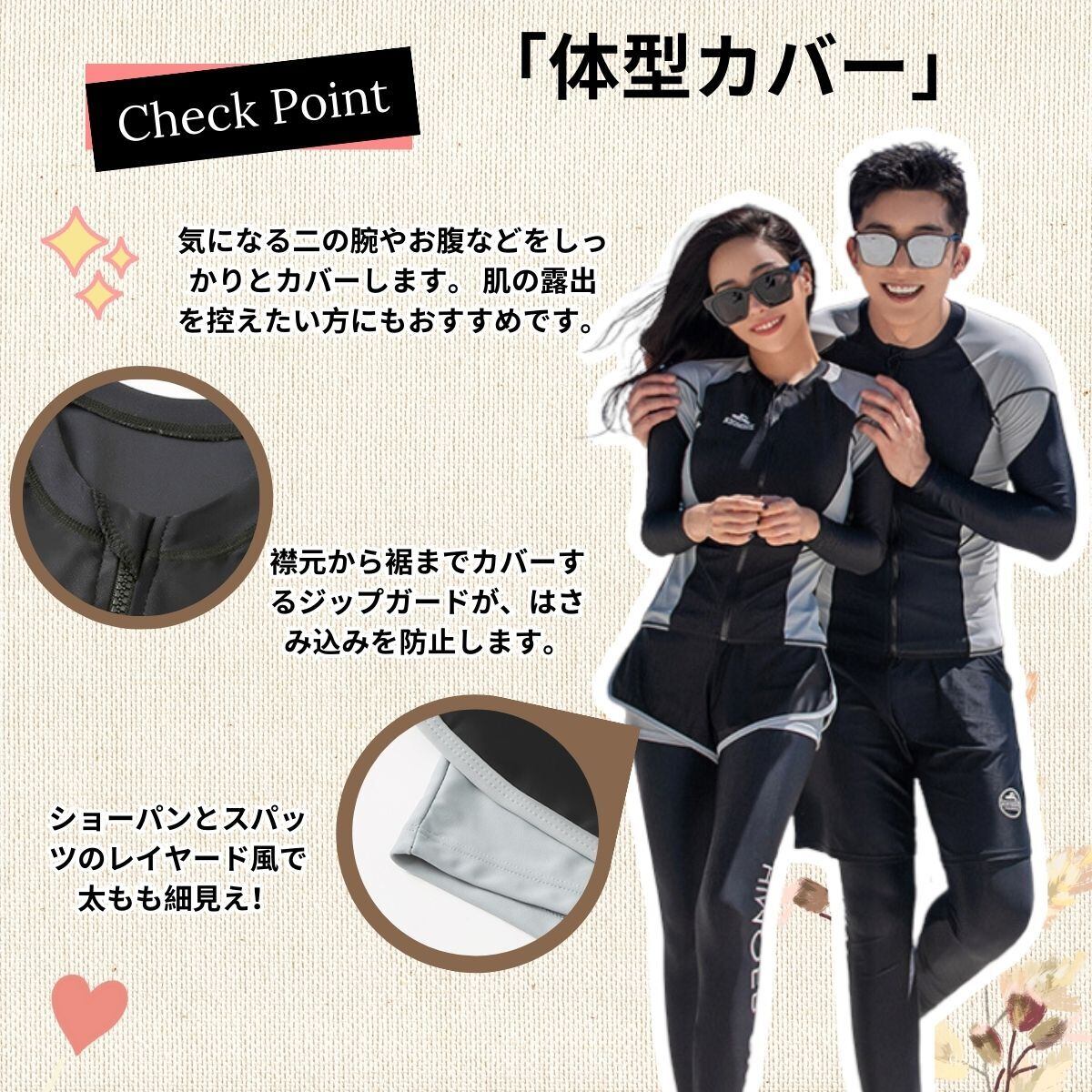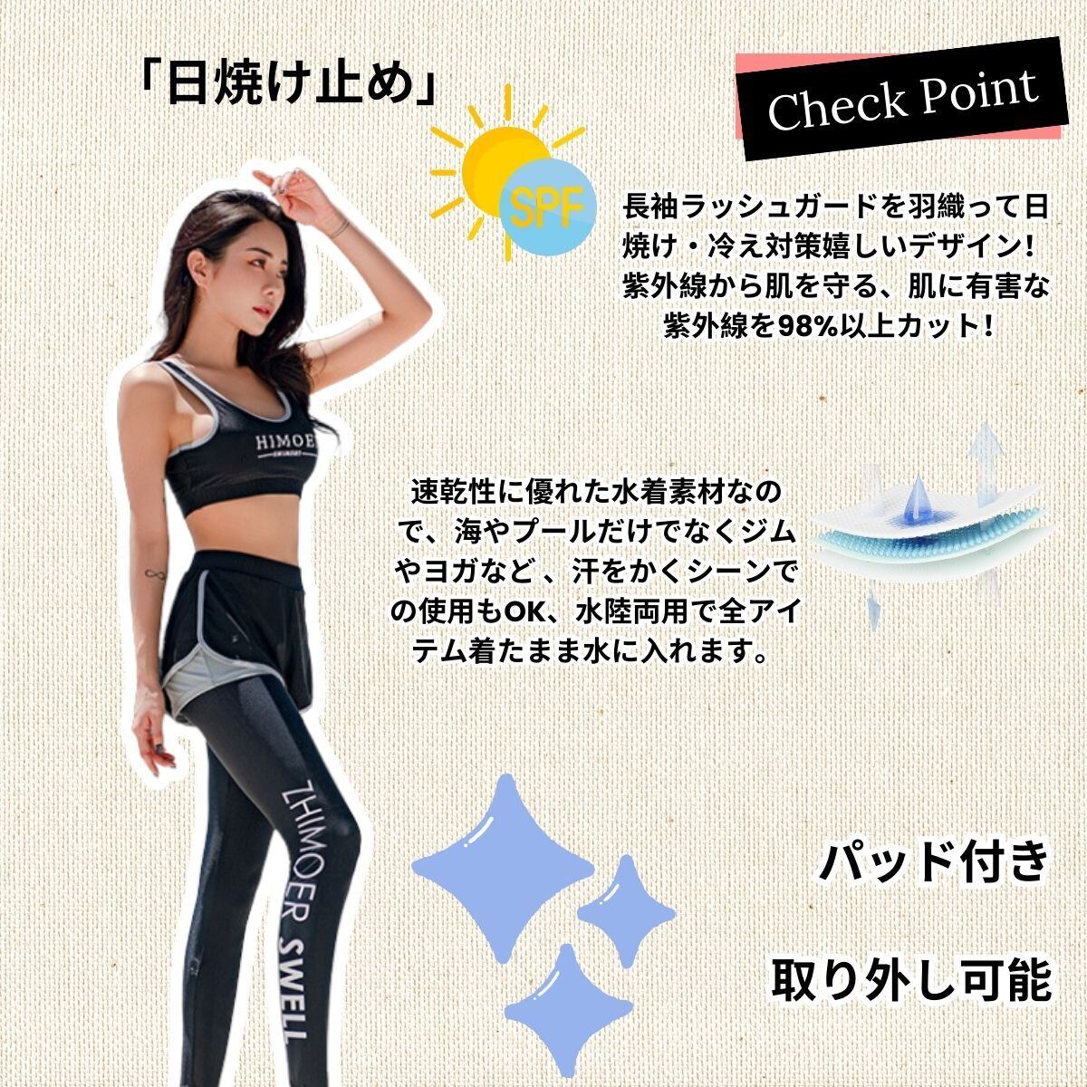 【速乾性】速乾性に優れた水着素材なので、海やプールだけでなくジムやヨガなど 、汗をかくシーンでの使用もOK、水陸両用で全アイテム着たまま水に入れます。水に濡れてもよく伸びる 縦横に伸縮するストレッチ素材で快適。軽やかな着心地でより自由自在な動きをサポートします。