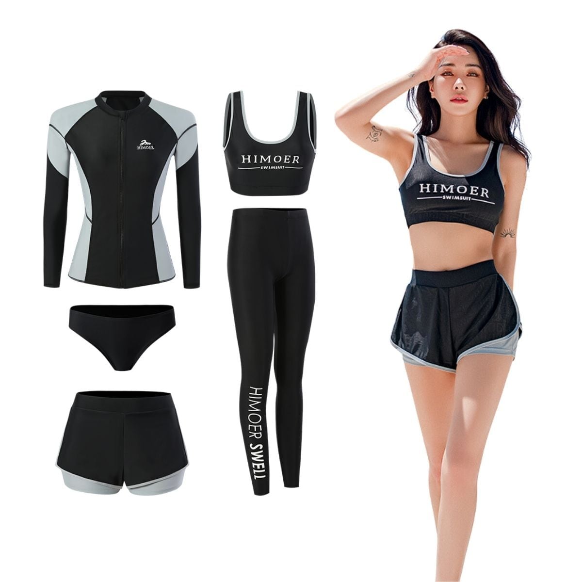 【デザイン&水着 レディース5点】ラッシュガード+ ショートパンツ+タンクトップ+ショーツ+レギンス。便利なセットのスイムウエアです。アイテムどうしの組み合わせが自在で、シーン・気温の変化に合わせてしっかり対応できる頼もしいセット!